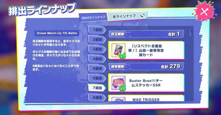 ボックスガチャは、目玉報酬を引くと任意のタイミングで次のボックスに切り替えが可能です。各種強化アイテムやメモリーカード「リスペクト全面衝突!(SR山田一郎)」が報酬として獲得できます。