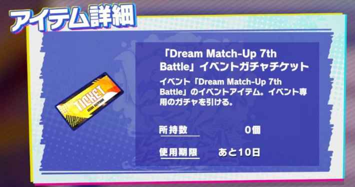 クエストやミッションをクリアすることで入手できる「Dream Match-Up 7th Battle」イベントガチャチケットを使い、期間限定のボックスガチャに挑戦できます。イベントガチャチケットはクエストクリアで入手できるので、クリアを目指してイベントを進めましょう。