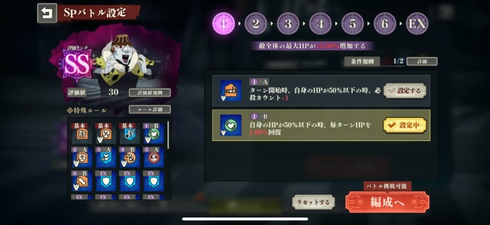 SPバトルは1度評価値6をクリアすることで「EX」が開放され、6以上の評価値を目指すことができる。まずは6項目全てを選びクリアをし、最高評価を目指そう。