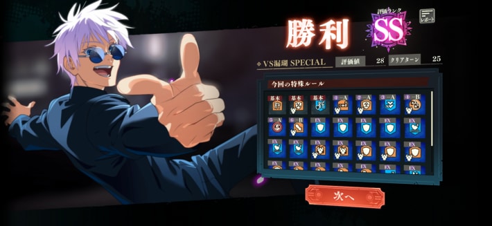 SPバトル漏瑚戦は難易度が高いので、妥協してクリアしても構わない。報酬を全部獲得したいときは、評価値28あれば全報酬獲得可能だ。設定を全て設定しなくても、全報酬獲得することができる。