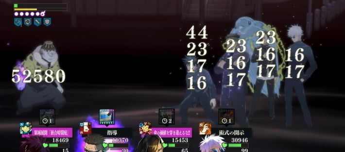 SPバトル設定でバフ弱体を選択し、デバフに特化した伏黒と夜蛾でダメージを強化する編成。。吉野はスキル1を重ねがけて使い、味方全体の被ダメ軽減を行おう。吉野のスキル1を毎ターン使えていれば、回復残滓なしでもクリアが可能だ。