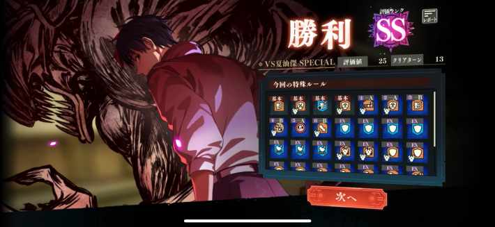 SPバトル夏油戦は難易度が高いので、妥協してクリアしても構わない。報酬を全部獲得したいときは、評価値28あれば全報酬獲得可能だ。設定を全て設定しなくても、全報酬獲得することができる。