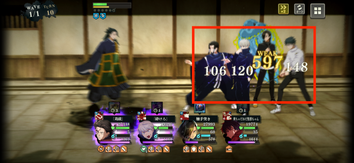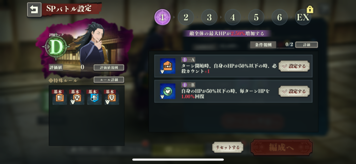 SPバトル設定でバフ弱体を選択し、宿儺を筆頭にデバッファー3体で火力を出す編成。 敵の火力を下げる効果はないので、全体回復残滓を編成して対策しよう。