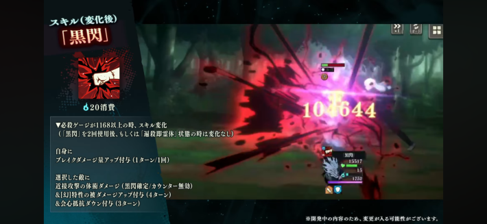 | Tips! | 「黒閃」は、スキル3が必殺ゲージ1168以上の時に使用できる。 |