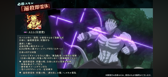 「遍殺即霊体」状態時の変化後スキル3は、プラス効果で「体術&術式アップ(3T)」「獲得必殺ゲージ量」が多く設定されている。単体の相手にはスキル3を連打する戦術が強力だ。