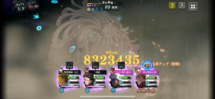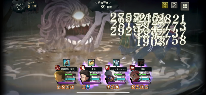 夢幻廻楼89階層パーティーは、夏油と加茂で毎ターンデバフを付与し、ミゲルと虎杖でダメージを与える編成。89階は被ダメが大きいので、全体回復残滓を複数枚装備する編成がおすすめだ。