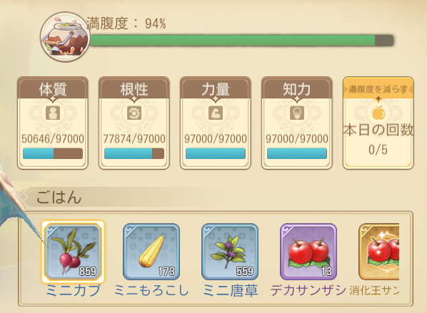 満腹ゲージが満タンになるとそれ以上ご飯を食べられなくなるが、サンザシを使うことで満腹度を減らすことができる。1日に5回まで使用できるので、ご飯が余ってしまったら使おう。