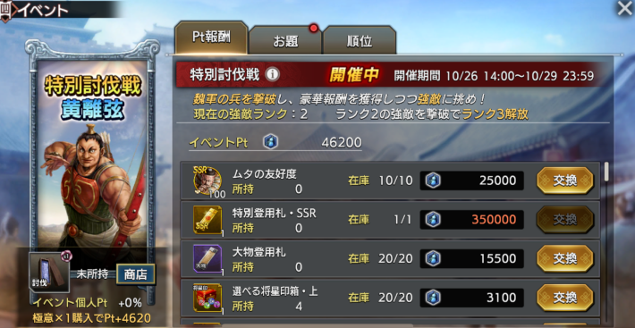 特別討伐戦 黄離弦は、マップ上に出現する魏兵を討伐してPtを集めるイベントです。初回の魏軍討伐戦から個人ランキングが追加され、上位300以内に入ると「縛虎申(ばくこしん)」の友好度や限定スタンプが獲得できます。