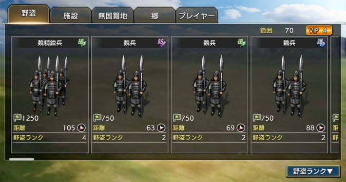 高ランクの魏兵は、サーチ機能の並べ替えを使って探しましょう。サーチ画面右下のタブから「野盗ランク」の「降順」にすることで、高ランクの魏兵が優先的に表示されます。