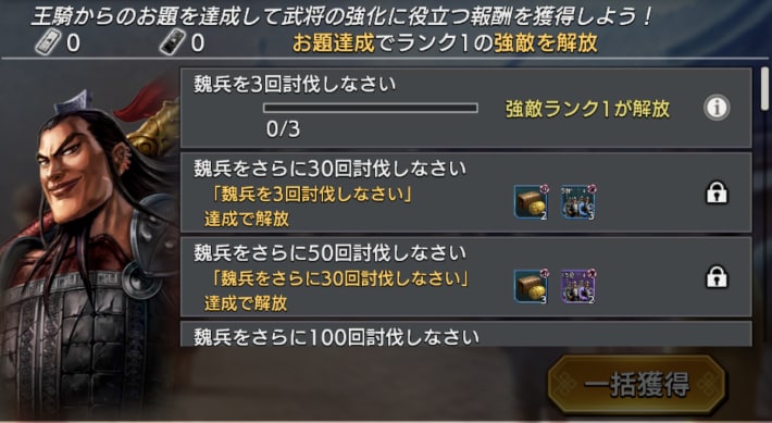 魏兵を3回討伐 | ・強敵ランク1の解放 |