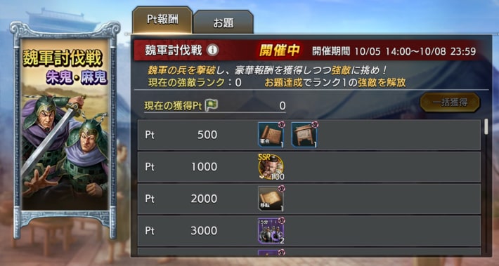 魏軍討伐戦は、マップ上に出現する魏兵を討伐してポイントを稼ぎ、累計ポイントに応じて報酬を獲得するイベント。報酬にはムタの友好度や英傑登用札など、貴重なアイテムが多く用意されている。