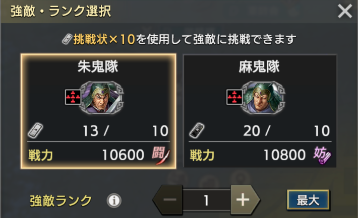 魏兵討伐時、確率で強敵の挑戦状が入手できます。挑戦状は強敵によって異なり、10枚集めると強敵に挑戦できます。呼び出した強敵は魏兵のように取り合いになることはありませんが、10分の出現時間があるので注意しましょう。
