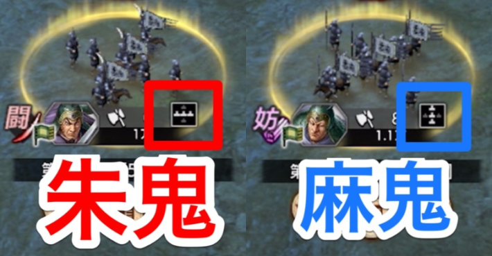 朱鬼は軍勢内の部隊が横一列に配置されているため、横列に戦威ダメージを与える王騎や干央などがおすすめです。対して麻鬼は縦一列に配置されているため、縦列に戦威ダメージを与える羌瘣や楚水がおすすめです。