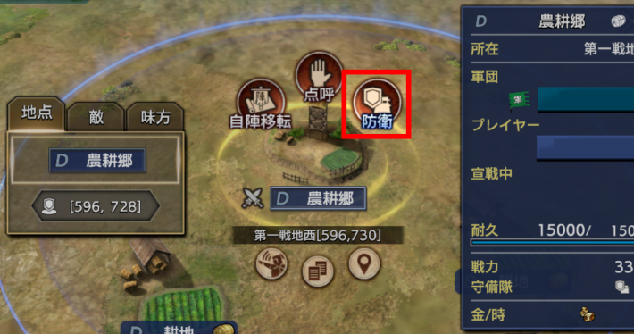 郷の防衛を行う場合は、郷をタップして防衛を選択しましょう。部隊を配置することで敵部隊と交戦を行います。