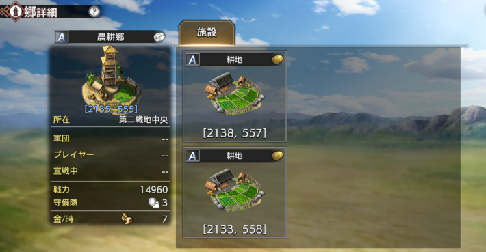 農耕郷では募兵に必要な兵糧が確保できます。兵力は軍団戦や野盗討伐など、ゲームプレイに必須な要素となるため、農耕郷を最優先で占拠しておきましょう。