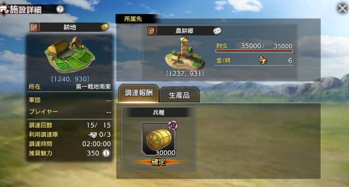 調達のできる施設には、1日に行える調達回数に上限があります。需要の高い農耕郷などは回数上限になりやすいため、複数占拠しておくことが望ましいです。