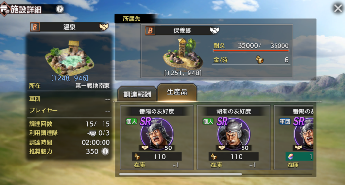 保養郷では、温泉の調達で施設限定の武将友好度や交流Ptを入手できます。入手できる武将の中には録嗚未や同金などの強力な武将もいるため、友好度を集めて獲得しましょう。武将は友好度を1000貯めることで獲得できます。