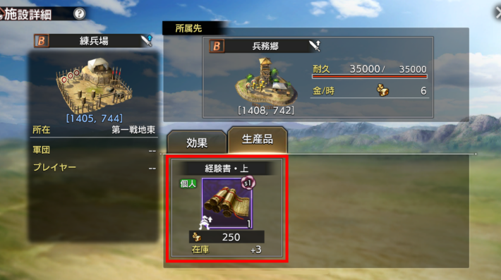 兵務郷と学務郷を占拠していると、生産品で経験書が入荷します。SSR武将の技能解放にはLv30まで上げる必要があるので、武将を強化したい場合も占拠しておきましょう。