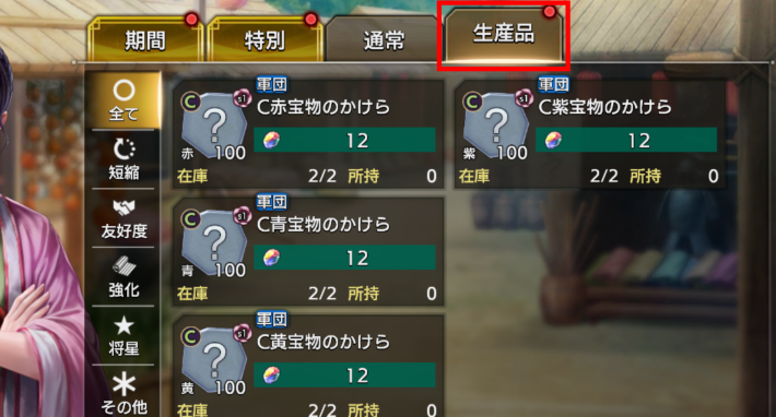 郷の範囲内の施設には「生産品」があり、占拠することで商店の「生産品」から購入できるようになります。生産品の購入には覇道石か金が必要となり、ガチャでは排出されない武将の友好度も購入できます。