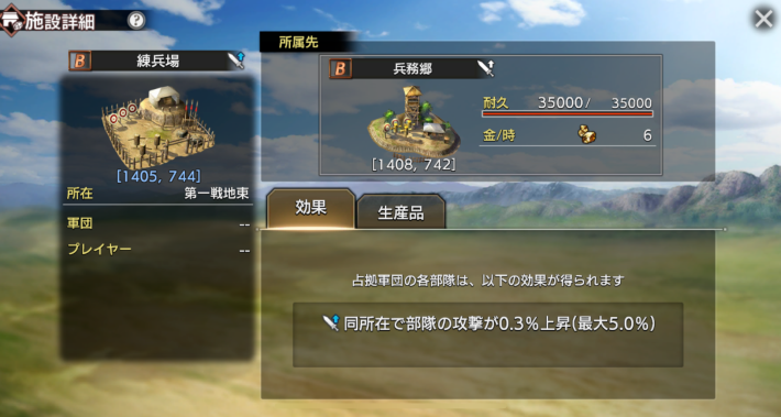 兵務郷 | 【練兵場】 範囲内から出陣した軍勢の攻撃を上昇 |