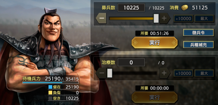 主に兵糧は、募兵を行う時に消費します。キングダム覇道では攻城戦や砦戦で大量の兵力を消耗するので、兵糧を集めて募兵を行い、待機兵力は常に余裕のある状態にしておきましょう。