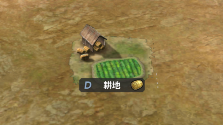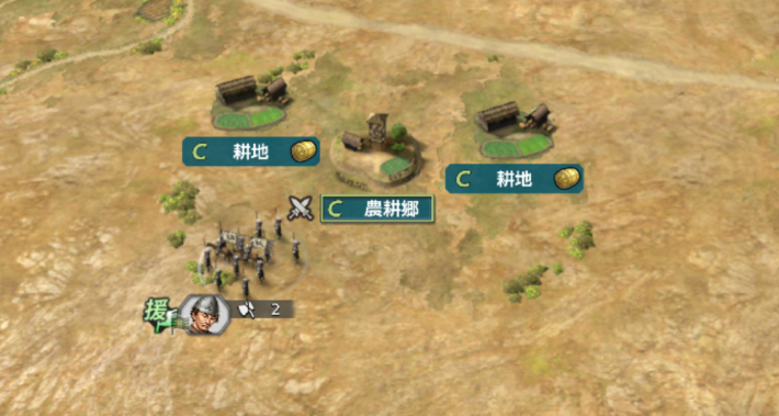 マップに点在する耕地に調達隊を向かわせると、一定時間後に兵糧を獲得できます。耕地にはそれぞれランクが設定されており、ランクが高ければ高いほど一回の調達で得られる兵糧も増えます。
