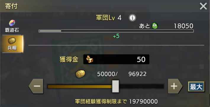 兵糧を寄付すると軍団に軍団経験が加算され、寄付したプレイヤーは金を入手できます。金は生産品でアイテムを購入するための貴重な資源ですが、兵糧の寄付で獲得できる軍団経験値・金はレートが悪いため、所持上限に達していて使い所がない場合のみ寄付しましょう。