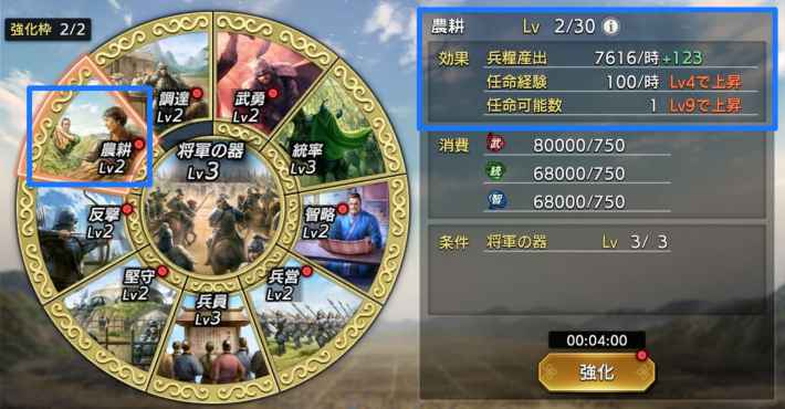 兵糧は、心得の中にある「農耕」のレベルに応じて入手できます。ボタンを押して回収する必要は無く、時間経過により自動で加算されます。また、技能「糧道」を持つ武将を兵糧に任命することで獲得量を増やせます。