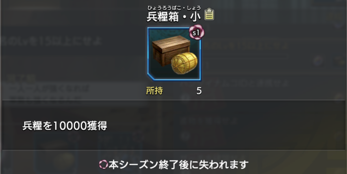アイテムの兵糧箱を使用すると、レアリティに応じた量の兵糧を獲得できます。兵糧箱はログインボーナスやミッション報酬などで入手できますが、シーズン終了時に消滅するので適度に使いながらゲームを進めましょう。