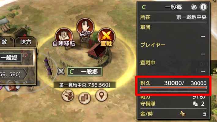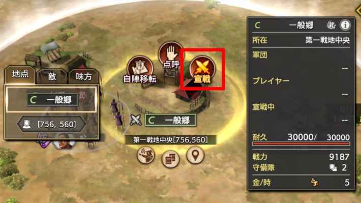 郷に対して宣戦するには、郷と同ランク以上の城砦か拠点を占拠する必要があります。占拠中の城砦と拠点が全て無くなると戦地の最初に戻されるので、郷の占拠だけでなく城砦や拠点も確実に保持しておきましょう。