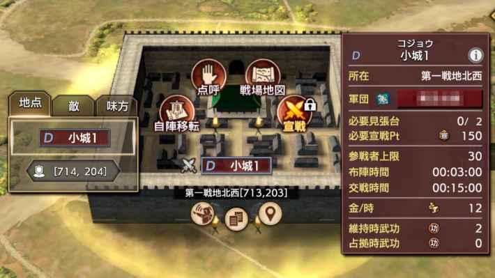 城・砦・拠点 | ・自身が軍団長か副団長である ・対象と隣接する城/砦/拠点を占拠している ・自陣から一定の範囲内に対象がある ・時刻が0:00~7:59ではない ・必要な宣戦ポイントがある ・必要な軍団Lvを満たしている |