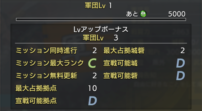 軍団が占拠できる城や砦のランクは軍団レベルによって決まります。軍団レベルが足りない場合は高ランクの城砦に対する宣戦もできないので、軍団ミッションの達成や兵糧の寄付などで軍団経験を稼ぎましょう。