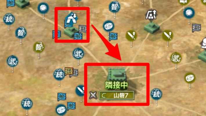 城や砦に宣戦するには、まず対象と隣接している建物の占拠が必要となります。道中の城や砦を飛ばして戦地の奥に進むことはできないので、手前から順に建物を占拠して戦地の最奥にある滎陽を目指しましょう。