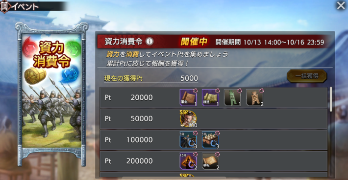 資力消費令では、消費した資力(兵糧、武心、統心、智心)に応じてイベントPtを獲得できます。イベントPtを集めることによって累計報酬が獲得でき、SSRムタの友好度や英傑登用札が入手できます。
