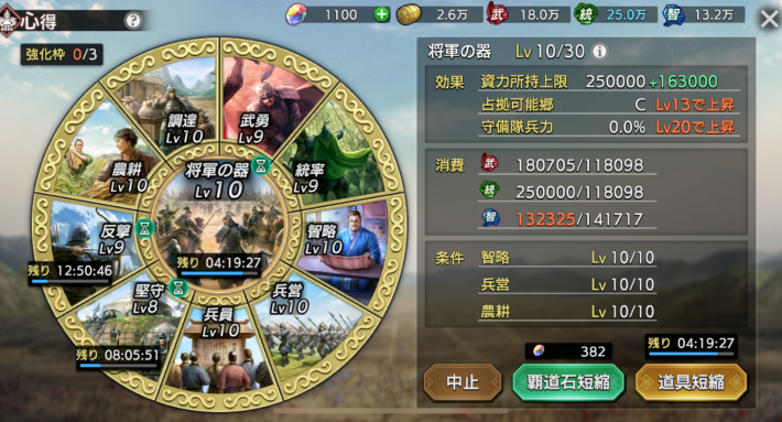 心得の強化は、一度に大量の資力を消費できる方法です。強化枠が限られており強化1回にも時間がかかるため、「心得強化短縮」を積極的に使って時短しましょう。資力は無駄になりますが、イベントPtを稼ぐだけなら強化→中止を繰り返す選択肢もありです。