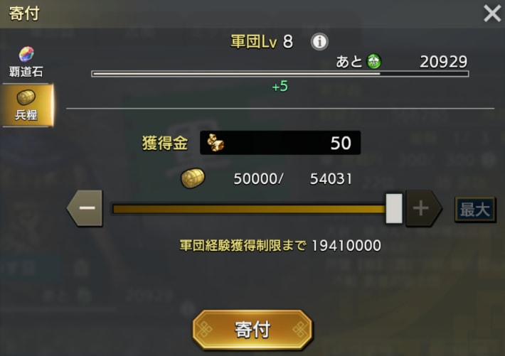 イベントPtは軍団への兵糧の寄付でも入手できます。リターンは少ない方法ですが、短時間で大量に資力を消費できるため、イベント終了までに報酬取り切りが間に合わないと感じたら積極的に利用しましょう。