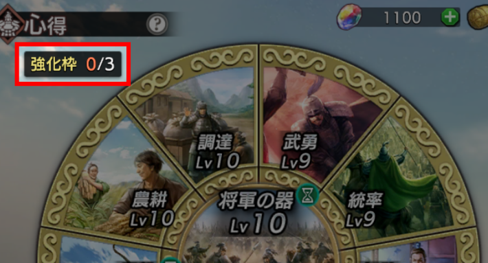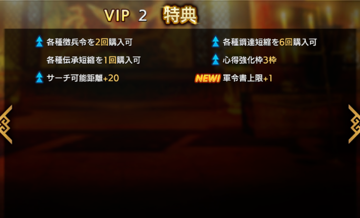 2 | 【必要VIPポイント】1,500pt ・各種徴兵令購入+2(+1) ・各種調達短縮購入+6(+1) ・各種伝承短縮購入+1 ・心得強化3枠(+1) ・サーチ可能距離+20(+10) ・軍令書上限+1 |