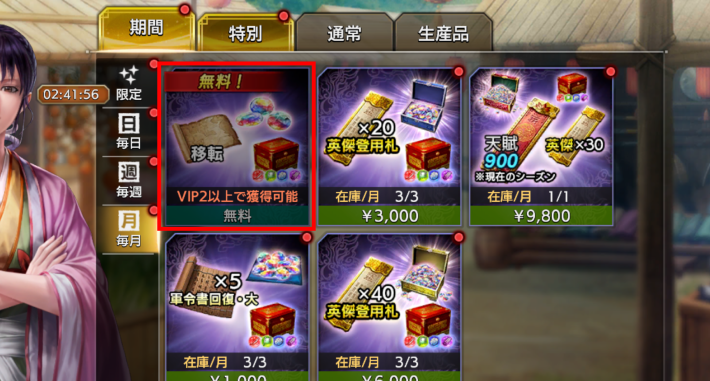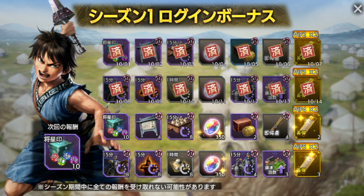 特定のVIPレベルに達していると、ログインボーナスで入手できる英傑登用札が2倍になります。受け取りの際に規定レベルに満たない場合は増加分が獲得できないため、VIPレベルは英傑登用札の日より前に上げておきましょう。