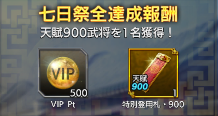 初心者イベント「七日祭」のミッション全達成報酬でも、VIPポイントを入手できます。獲得まで最低7日間は必要ですが、無課金でもVIPポイントが獲得できる貴重なイベントなので、開催期間中に必ず全達成しておきましょう。