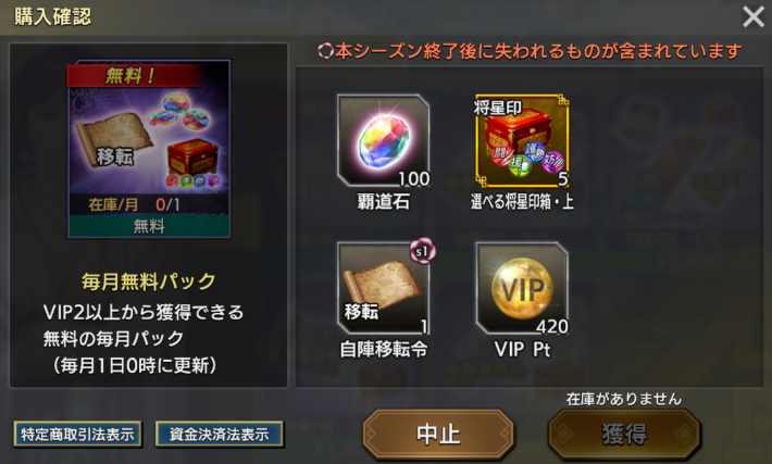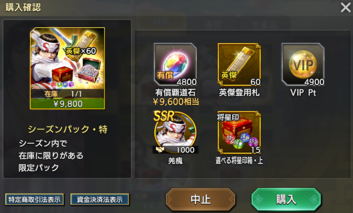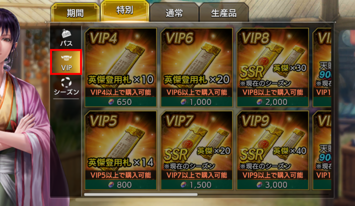 商店では、到達したVIPレベルに応じて「VIPパック」が購入できるようになります。無償覇道石で英傑登用札が入手できるので、VIPレベルが上がったらぜひ購入しておきたいパックです。