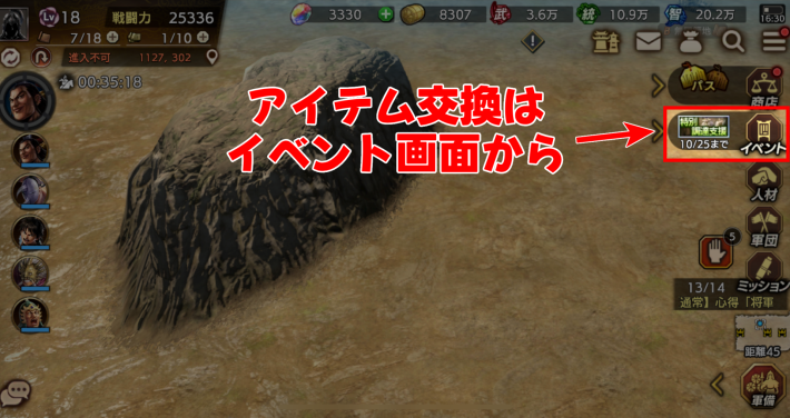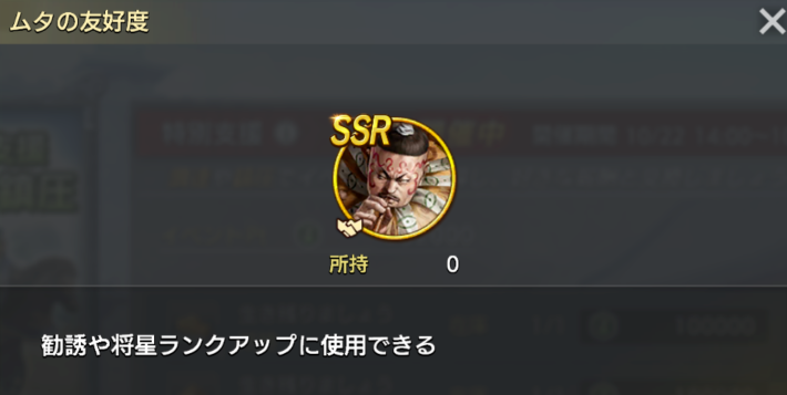 ムタは「掃討」「鋭鋒」など、優秀な技能を持つ補佐向きの武将です。以前のイベントで獲得できていない場合はこちらも優先して交換しておきましょう。