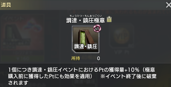 「調達・鎮圧極意」のポイントボーナスは、購入前に獲得したポイントに対しても有効です。イベントの途中で購入しても差分のポイントが付与されるので、イベント終盤でポイントが足りない場合に購入するという選択肢もあります。