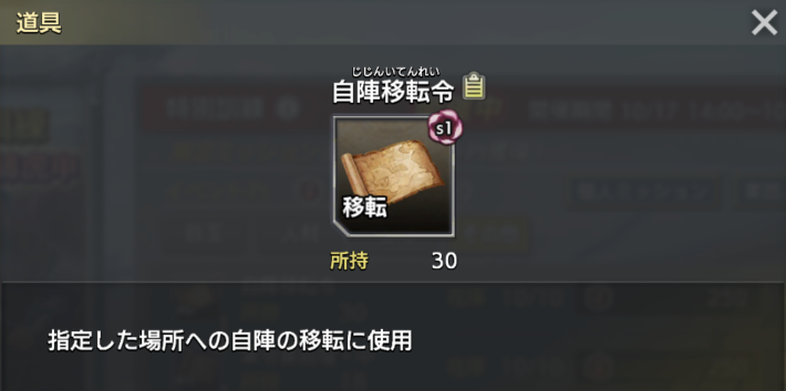 自陣移転令は郷戦や軍団戦などで消費量が多いため、できるだけ多く回収しておきましょう。自陣移転令が足りている場合は、軍令書や調達書の回復アイテムを交換しておきましょう。
