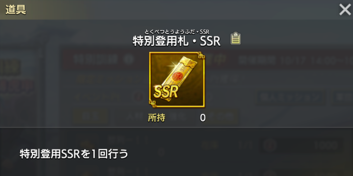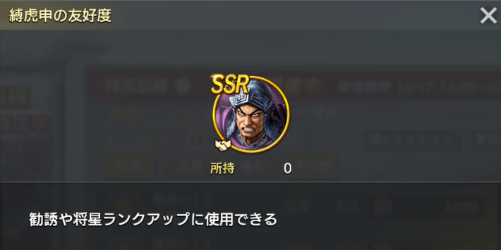 特別登用札・SSRは縛虎申の友好度に次いで交換したいアイテムです。特別登用札・SSRではSSR以上の武将を確定で1体入手できるため、未入手の武将がいる場合は優先して交換しましょう。
