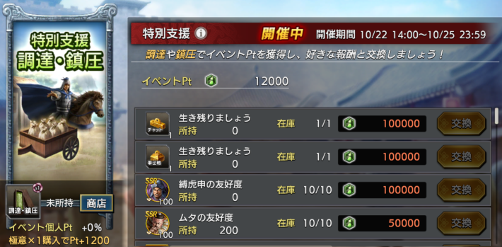 特別支援 調達・鎮圧は調達・鎮圧によって獲得したポイントをイベントアイテムと交換するイベントです。報酬には天賦850武将「縛虎申」の友好度やSSR武将が確定で入手できる登用札などが交換できます。