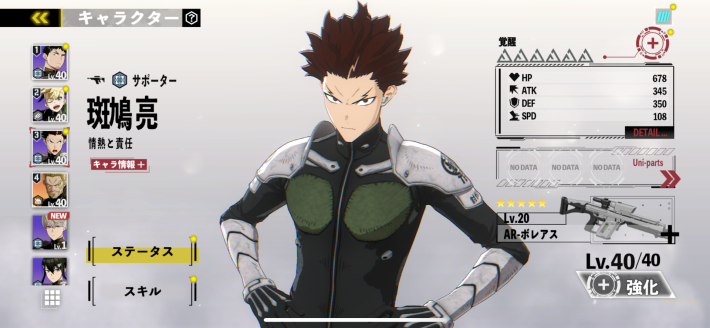 斑鳩亮 | ・味方にスピードバフ付与が可能 ・ATK付与で火力面もサポート ・凸でスピードバフの継続ターンが増加 |