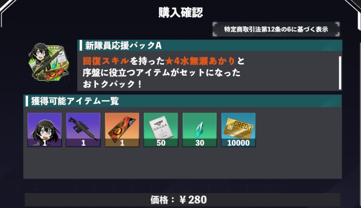 ショップにある「新隊員応援パックA」を購入すると、水無瀬や★4武器「AR-ハニービー84」などが貰えます。ハニービー84は水無瀬と相性が良い武器なので、パック購入後はあかりにハニービー84を装備しましょう。