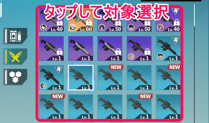覚醒画面が開いたら、画面左側の武器アイコンをタップして素材を選択しましょう。
