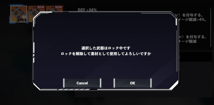 武器覚醒の素材選択時、ロックされている武器を選択することができます。選択した際に画像のような表示が出るので、OKを押すとロックが解除され素材として選択されます。