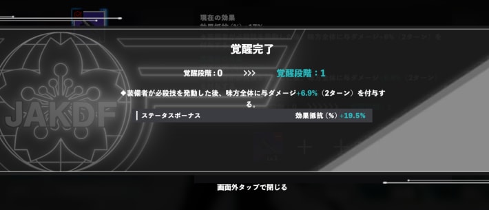 素材選択が完了したら、画面右下にある「覚醒」をタップ。覚醒完了の画面が表示されるので、画面外をタップして完了画面を閉じましょう。